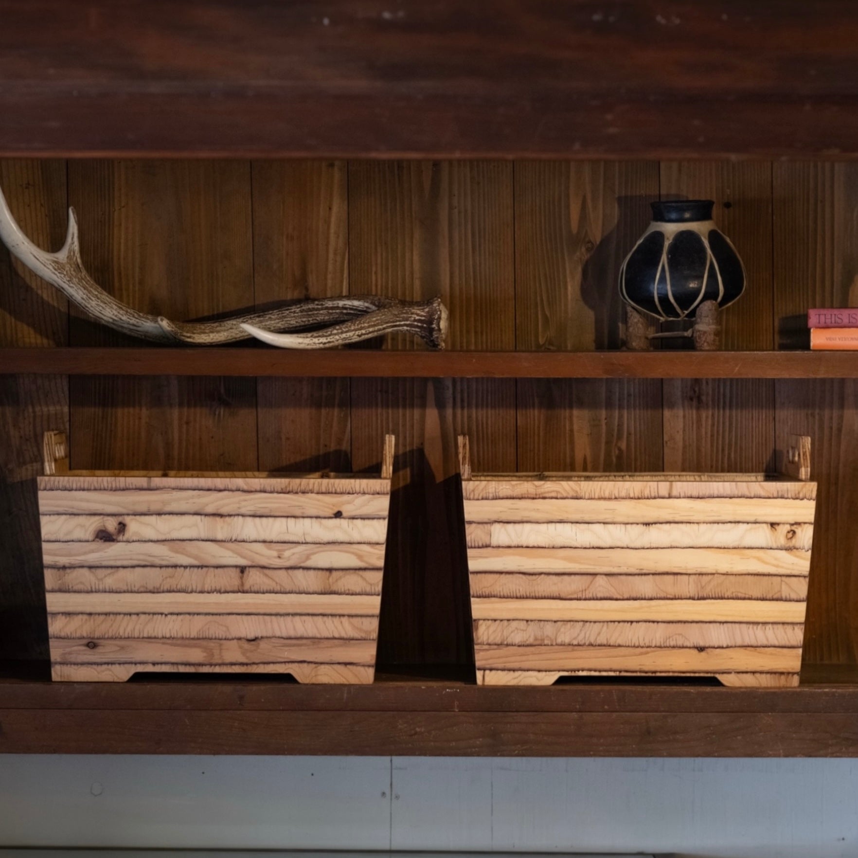 【Diagonal board シリーズ】は、合板の新たな魅力を提案したプロダクトです。斜めにスライスした合板を素材に使用し、技術的にも新しいアプローチとなっています。これまでに見たことのない魅力ある表情と質感は、目を引く存在感を持っており、側面にみえる斜め模様もユニークです。