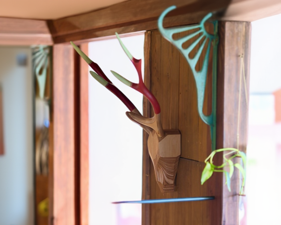 「Deer Hunting Trophy」は、バーチ合板を削り出して作られた、美しい鹿の角をモチーフにしたオブジェです。鹿は毎年角を落とし、新たに生やすことで、再生や新たな始まりの象徴とされています。この自然のサイクルは、生命の持続力や自然の循環を感じさせるものです。